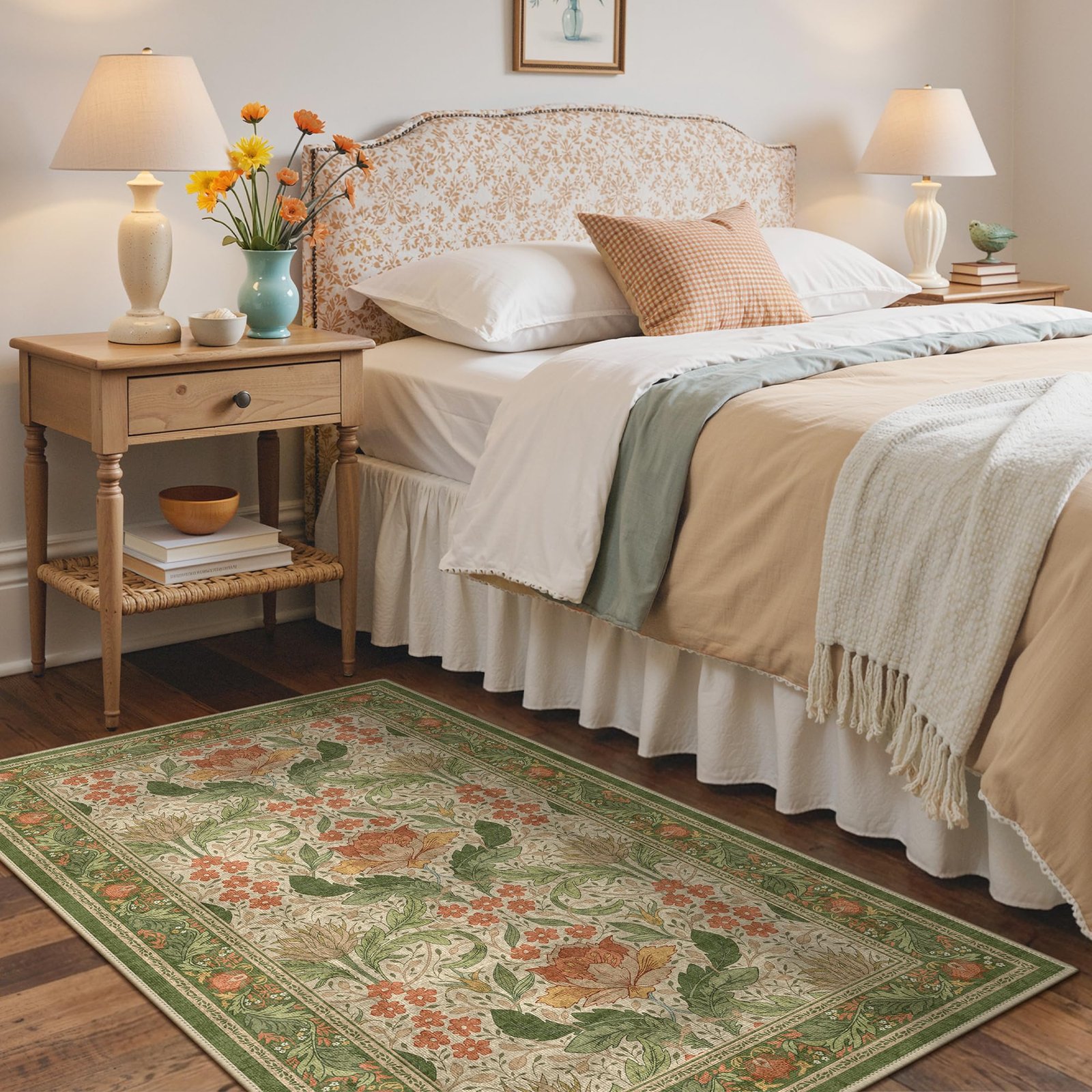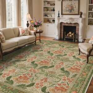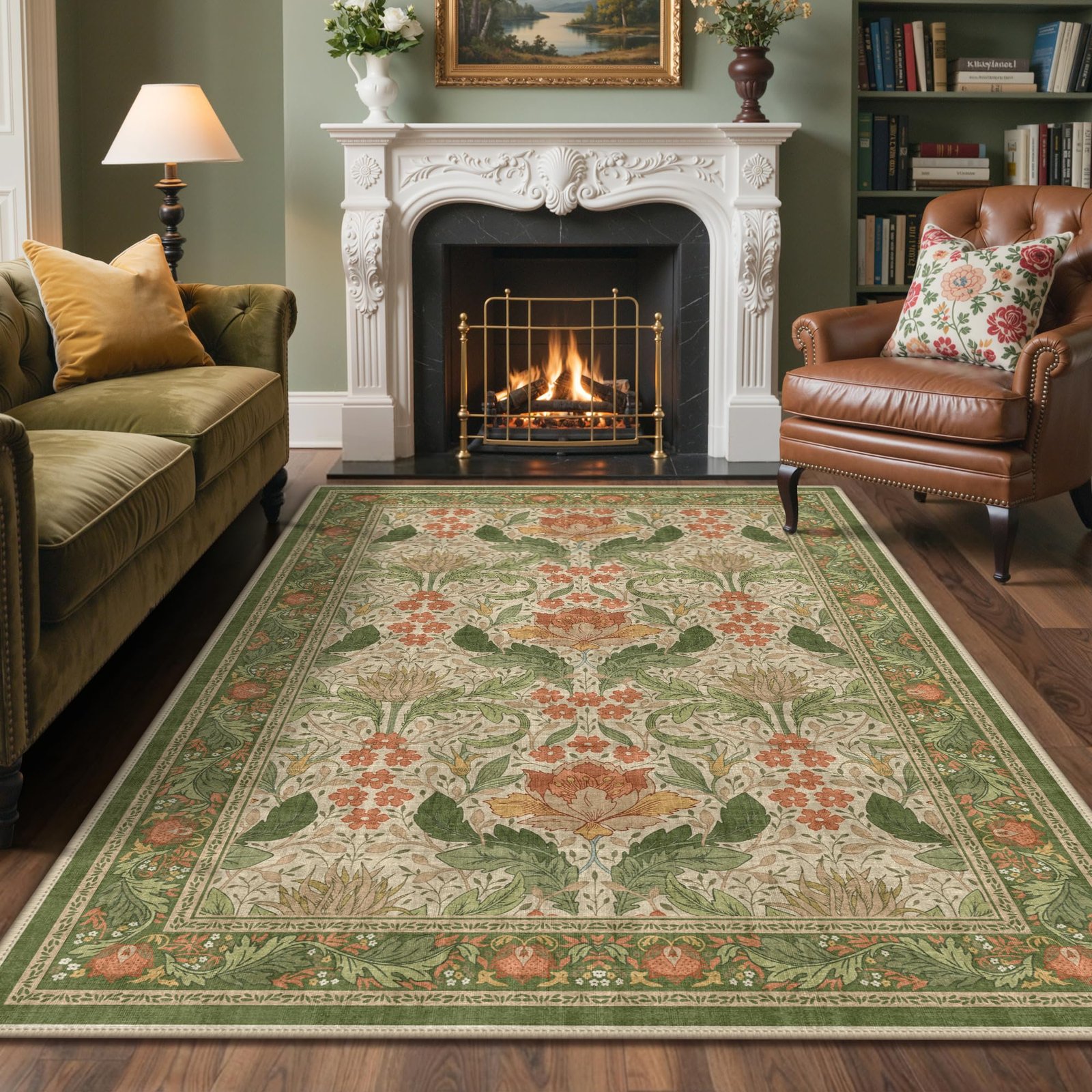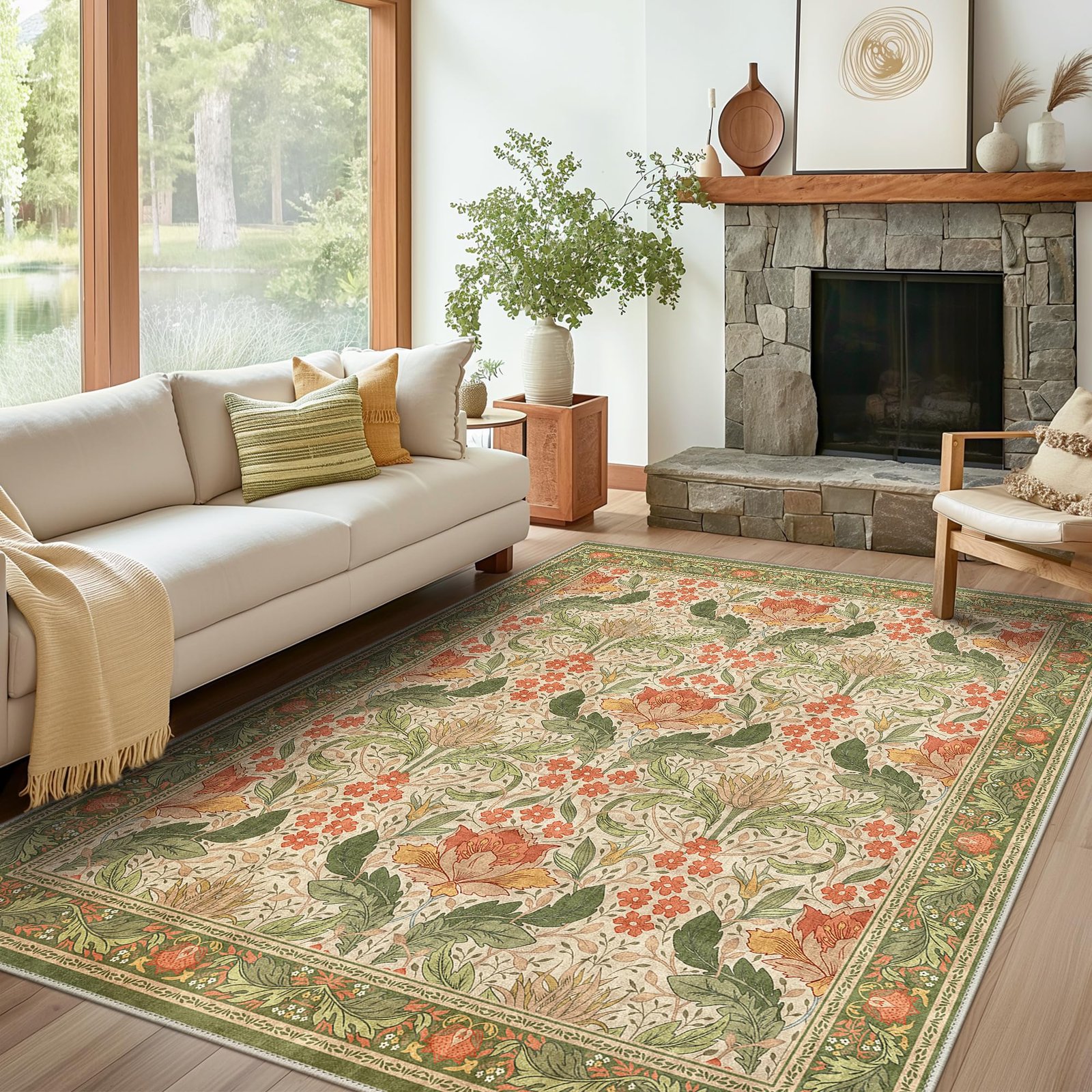DAIMYO HILLS 8×10 Area Rugs for Living Room, Microfiber Machine Washable Non-Slip Vintage Floral Rug, Low Pile Lightweight Carpet for Bedroom, Dining Room, Home Office, Sage Green & Burnt Orange