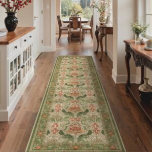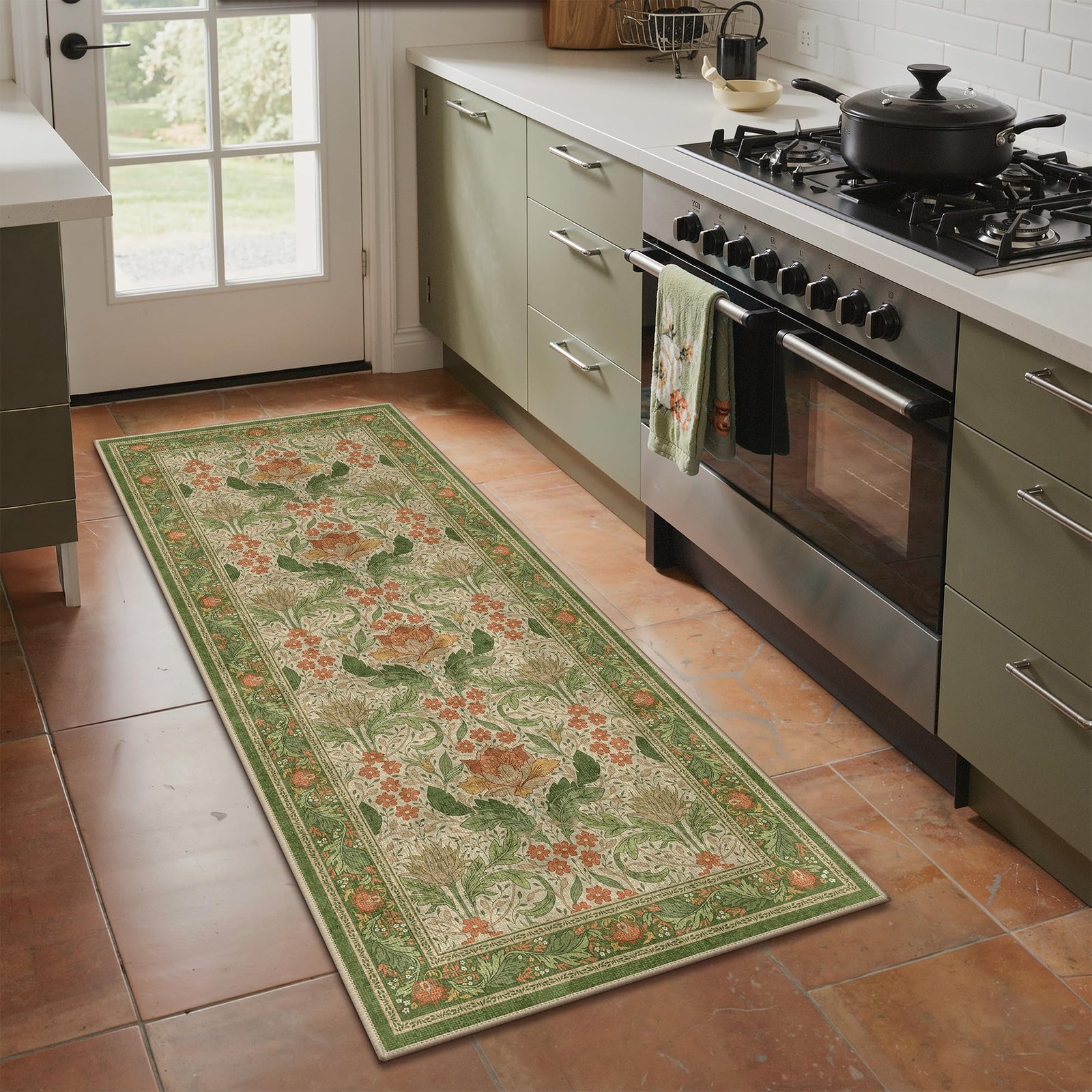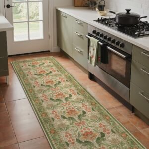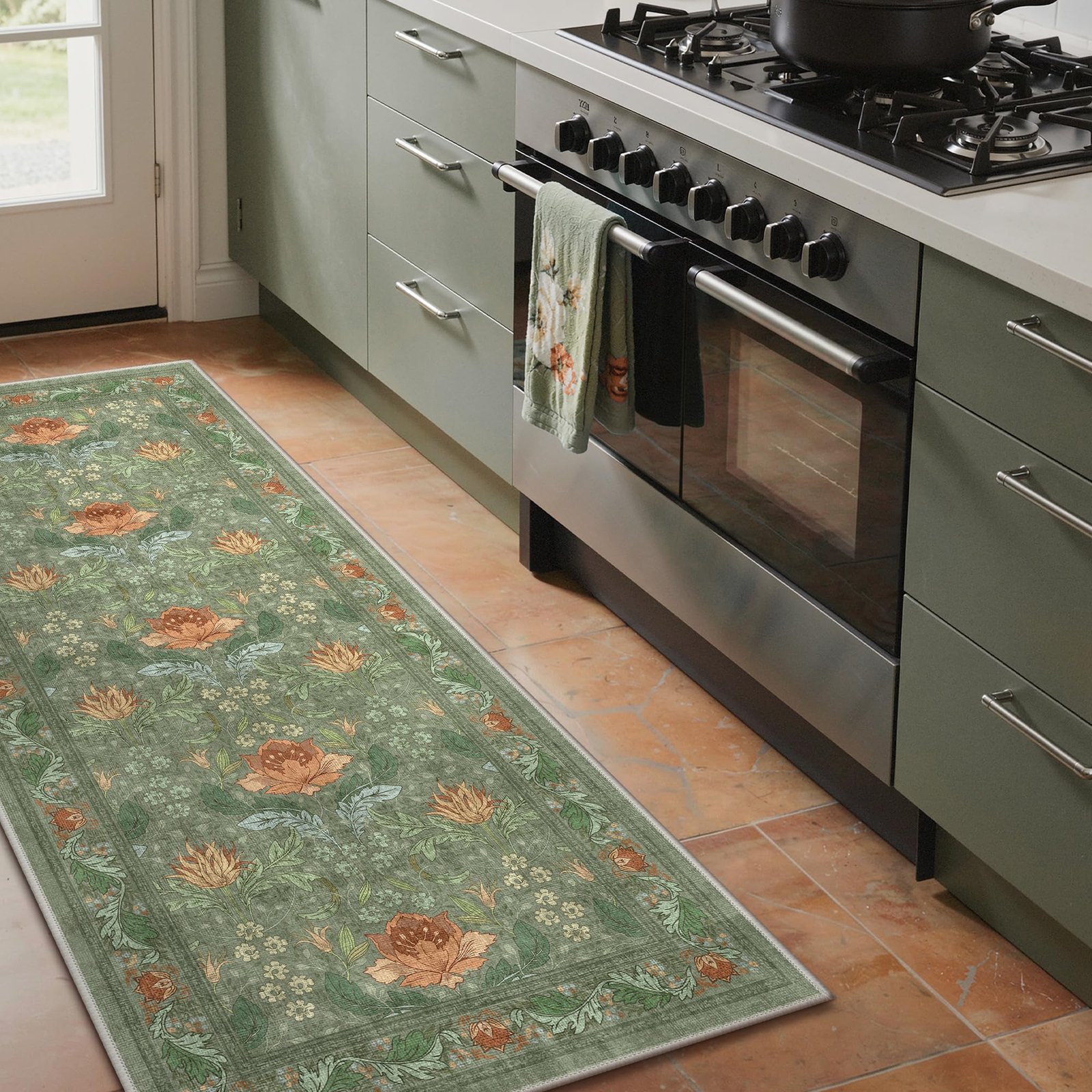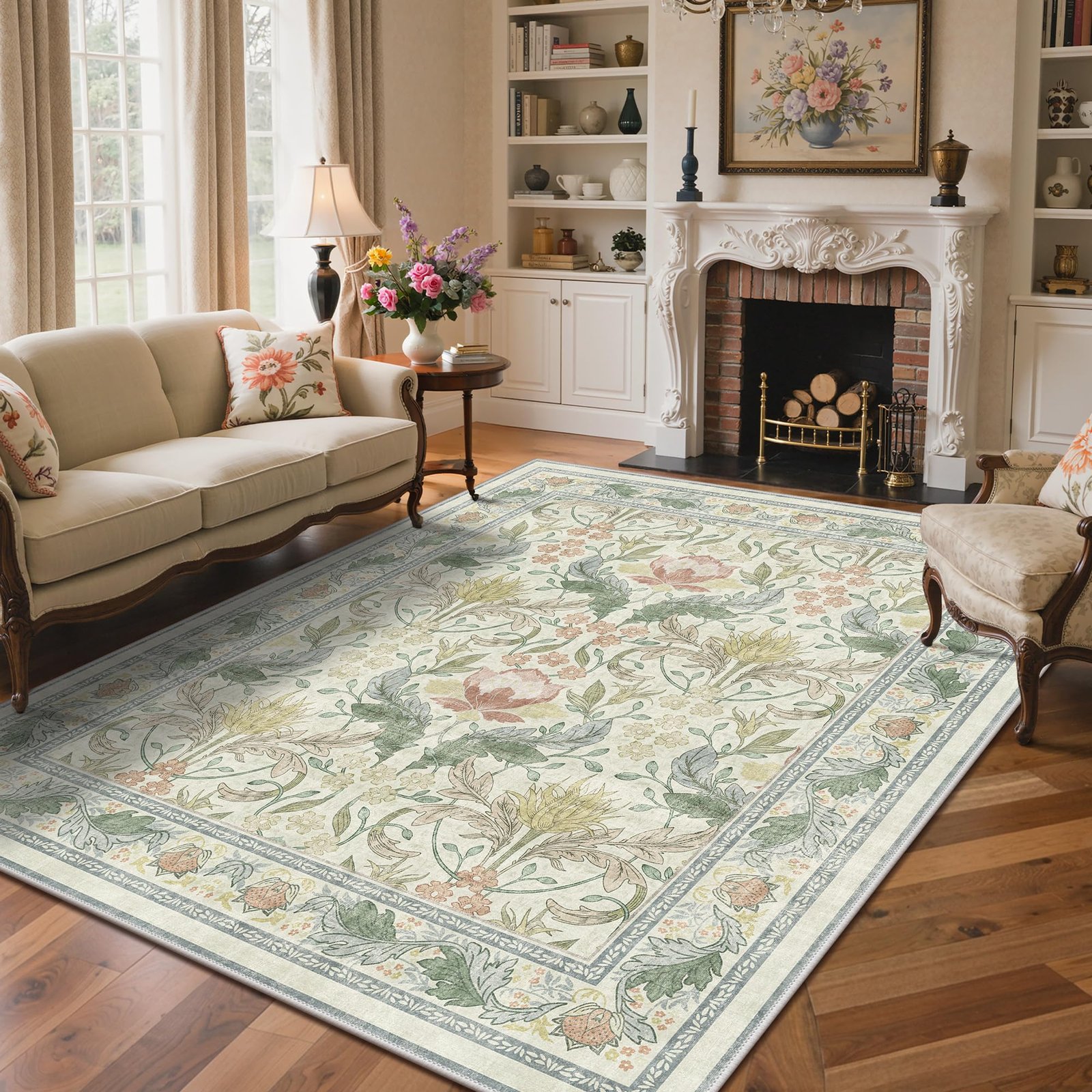 DAIMYO HILLS 8×10 Area Rugs for Living Room, Microfiber Machine Washable Non-Slip Vintage Floral Rug, Low Pile Lightweight Carpet for Bedroom, Dining Room, Home Office, Sage Green & Burnt Orange